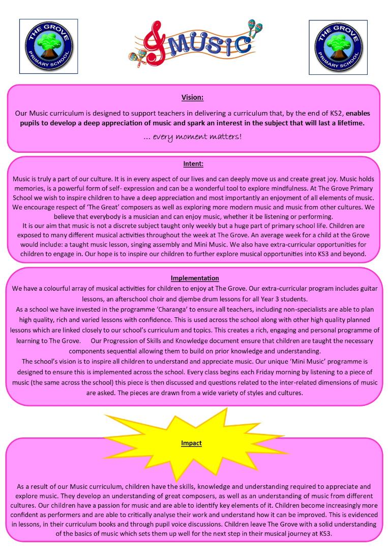 Year 3, children experience a whole year of djembe drum lessons which are provided by a specialist First Access teacher. The impact of this means the every child during their time at The Grove will receive high quality music tuition on a weekly basis for a whole year. Children build on many life skills during these sessions including resilience, teamwork and determination. These qualities help them to become more rounded individuals.
