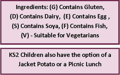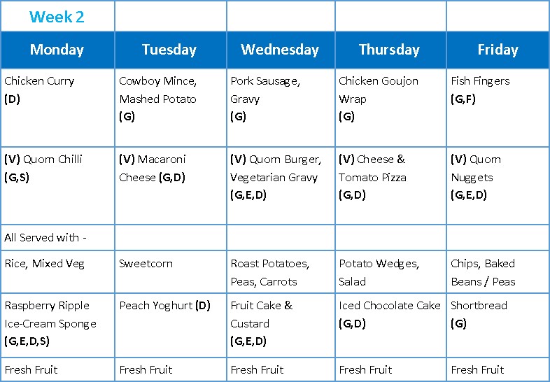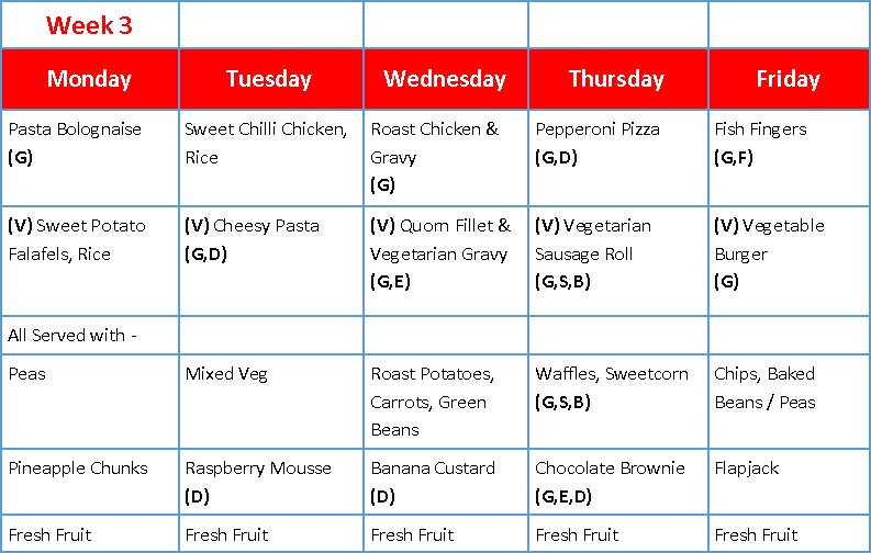 Our fantastic, nutritious, school meals are charged at £2.60 per meal. We operate a 3 week, rolling menu cycle and meals should be paid for in advance, (by the Friday before meals are due to be taken).